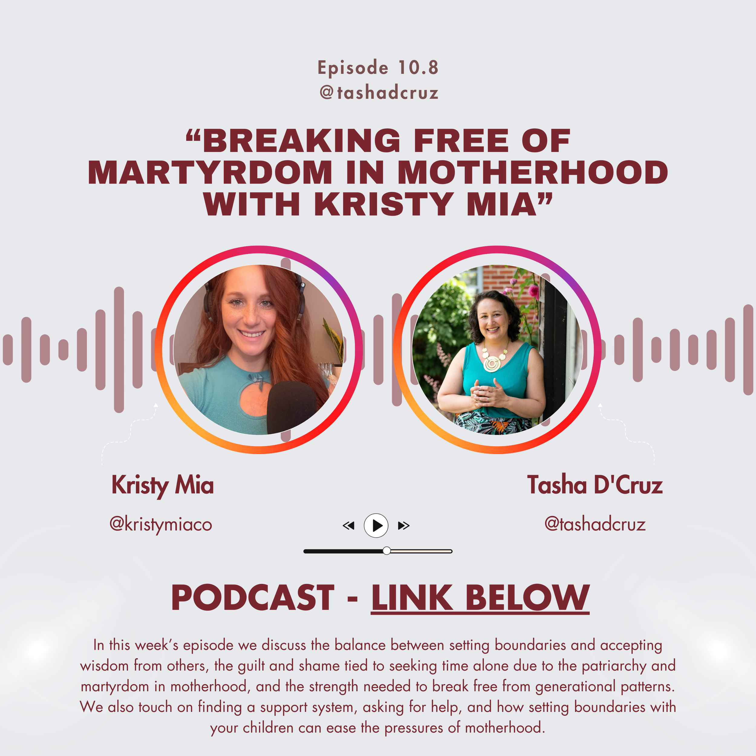 In this week’s episode we discuss the balance between setting boundaries and accepting wisdom from others, the guilt and shame tied to seeking time alone due to the patriarchy and martyrdom in motherhood, and the strength needed to break free from generational patterns. We also touch on finding a support system, asking for help, and how setting boundaries with your children can ease the pressures of motherhood.